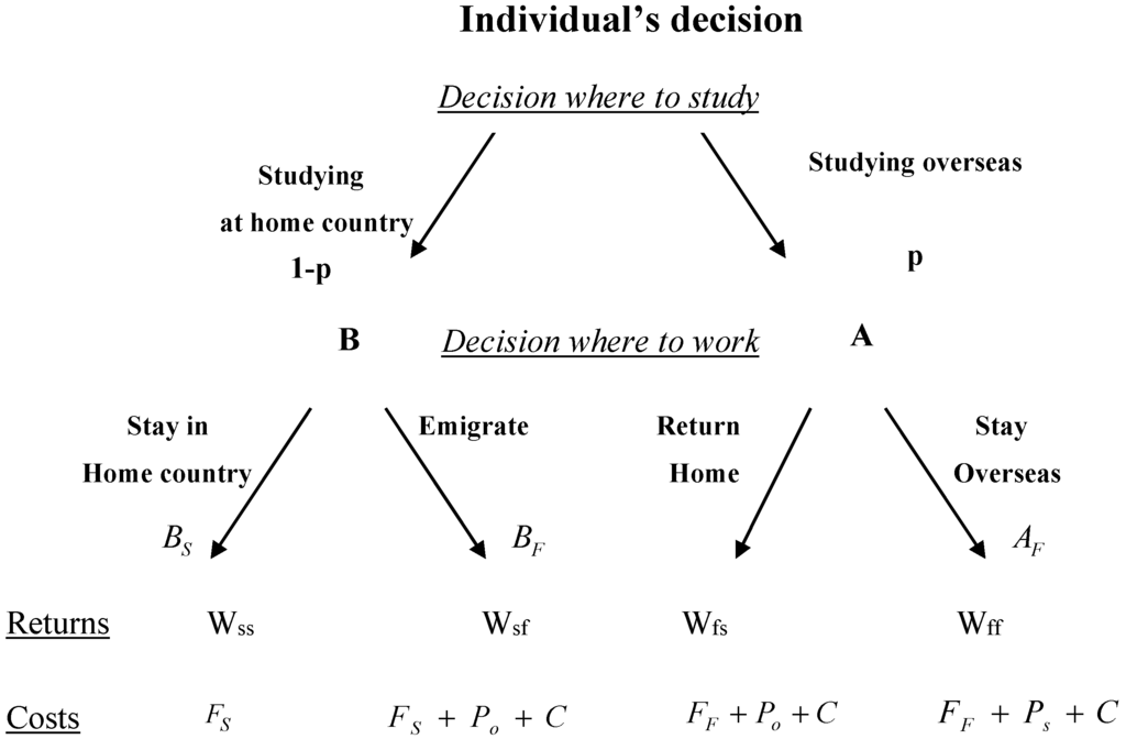 The model we develop is the following: In the first period, individuals invest in acquiring human capital, H, and decide whether to study overseas, denoted as F, or in their home country, denoted as S. Their decision is a function of the costs and benefits from acquiring human capital. In the second period, they decide where to work. Let us start by analyzing the costs as well as the benefits of each of the decisions.