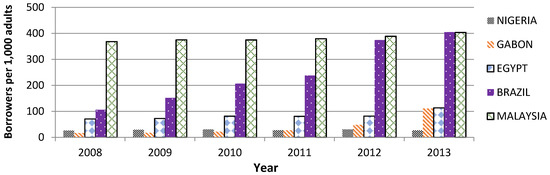 Furthermore, Figure 1 shows some countries’ variation in level of activities of the banking sector, which provides interesting insights about the status of financial inclusion around the world. The wide disparity is noteworthy when comparing financial inclusion trends. The lack of depth of financial inclusion becomes stark when compared to other countries. In general, Nigeria has among the lowest access to bank credits. In 2013 Nigeria had 26.96 per 1000 adults borrowing from banks. It was 110.91 per 1000 adults for Gabon, 405.15 per 1000 adults for Brazil, and 403.35 per 1000 adults for Malaysia. This means that while only 1 in every 37 adults in Nigeria had access to bank credits in 2013, 1 in every 9 adults in Gabon, and 1 in every 2 adults in Brazil and in Malaysia accessed bank credits. According to Soludo, 2008 [3], financial services are available to about 40 percent of the population and more than 60 percent of the poor do not have access to formal finance and are forced to rely on a narrow range of risky and expensive informal services that constrain their ability to participate fully in the markets to increase their income and contribution to economic growth. The limited access to finances and the inadequate lending to economic agents in Nigeria, especially the real sector that could result in economic growth, have raised questions about the effectiveness of financial institutions in meeting their financial intermediation functions.