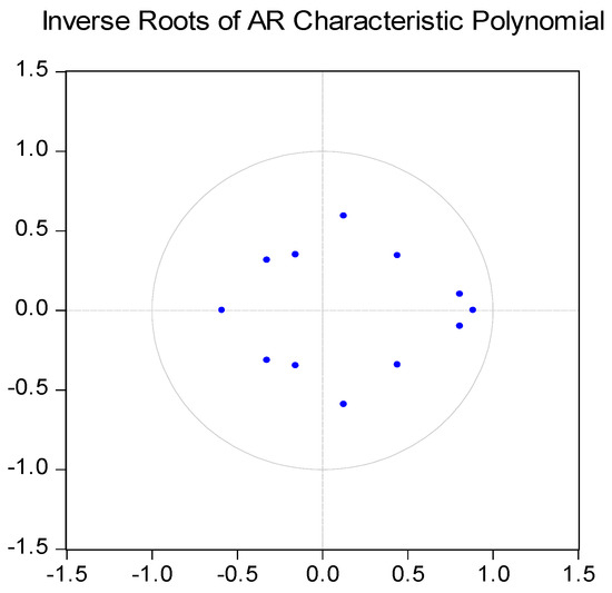 Overall, the causality result supports the view that causality runs from financial development to economic growth, implying that the supply-leading hypothesis prevails in Nigeria. The supply-leading hypothesis was developed by Goldsmith, 1969 [16], who suggested that financial development has a positive causal impact on economic growth as it could boost the capital accumulation efficiency and/or increase the level of savings and thus the level of investment, as suggested by McKinnon, 1973 [14], and Shaw, 1967 [12]. In other words, through a growth in savings and an increase in investment efficiency, financial development may play a key role in growing national output (Levine, 1997 [54]). Moreover, this would create incentives for financial innovations and the implementation of new technology. The Roots of Characteristic Polynomial presented in Figure 2 and Table 6 reveal that no root lies outside the unit circle, indicating that the model satisfies the stability condition and exhibits good fit.