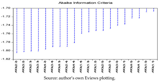 The second step in estimating the ARDL bound testing approach, after the Cointegration is determined, the conditional ARDL long run model for and are estimated as: