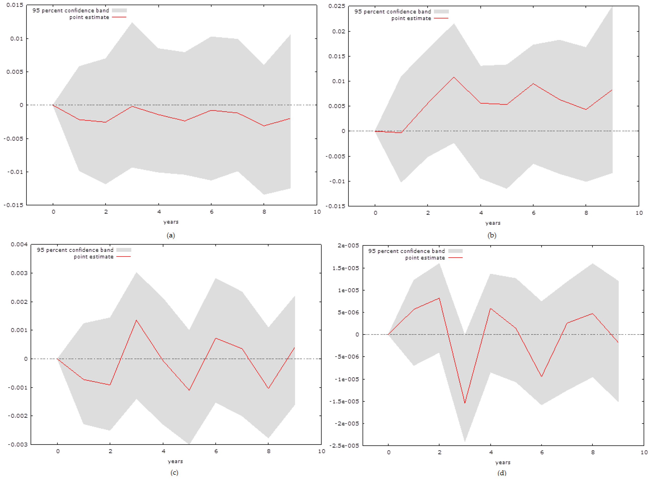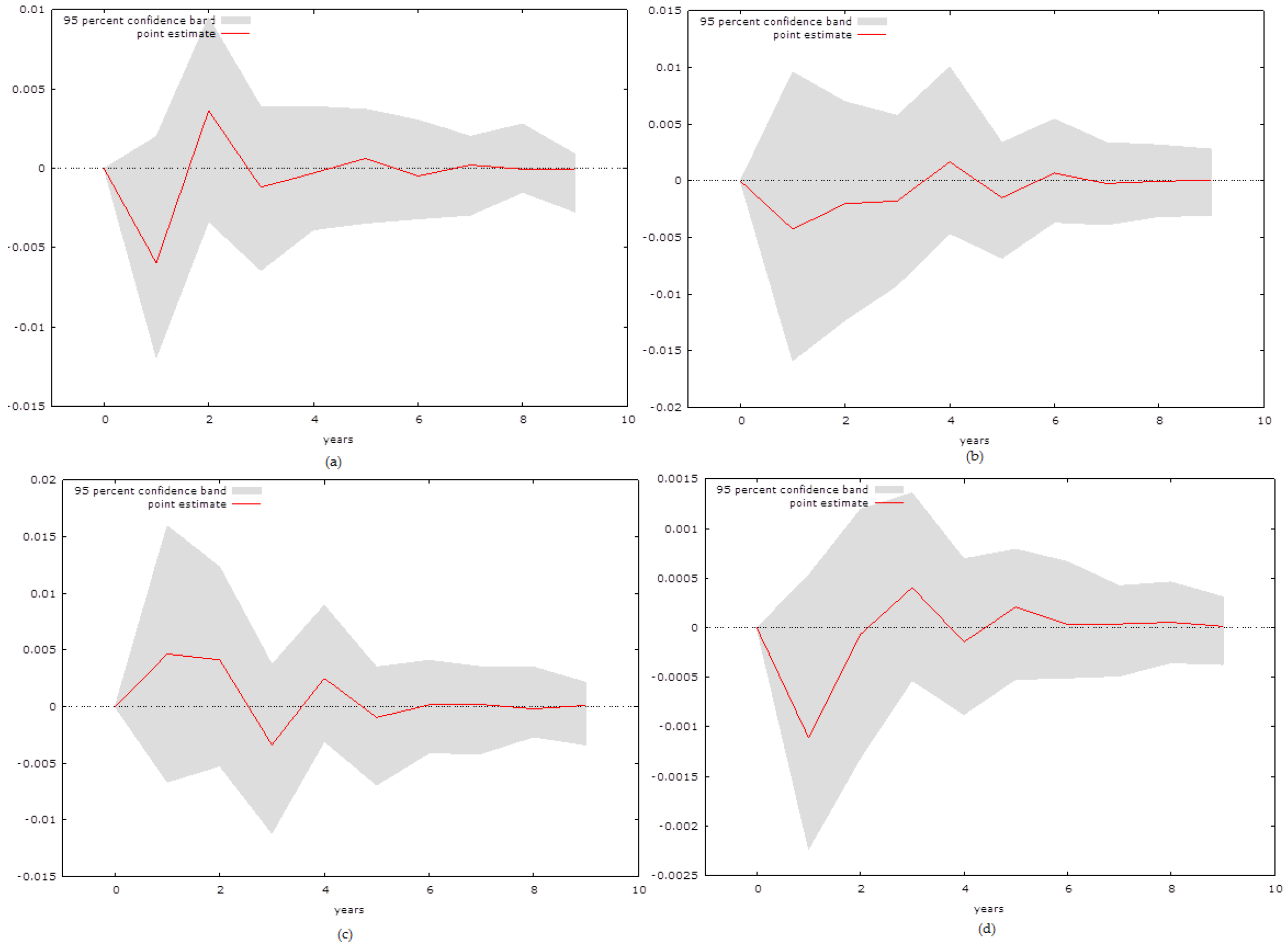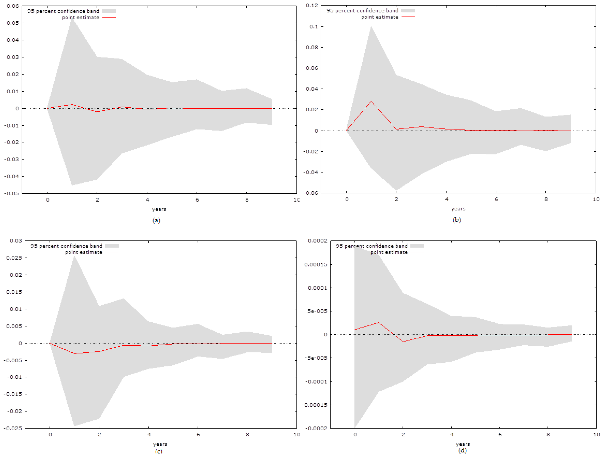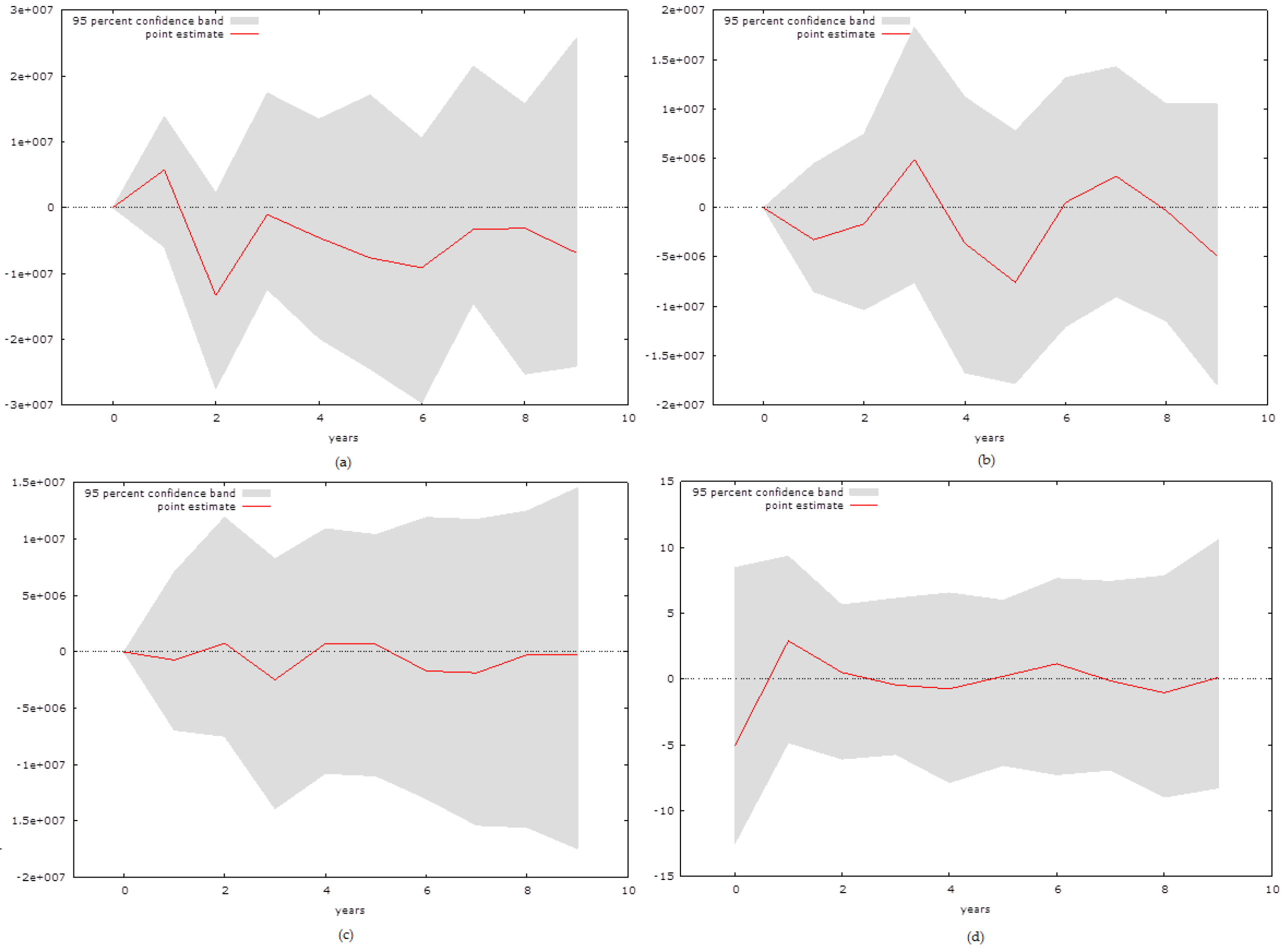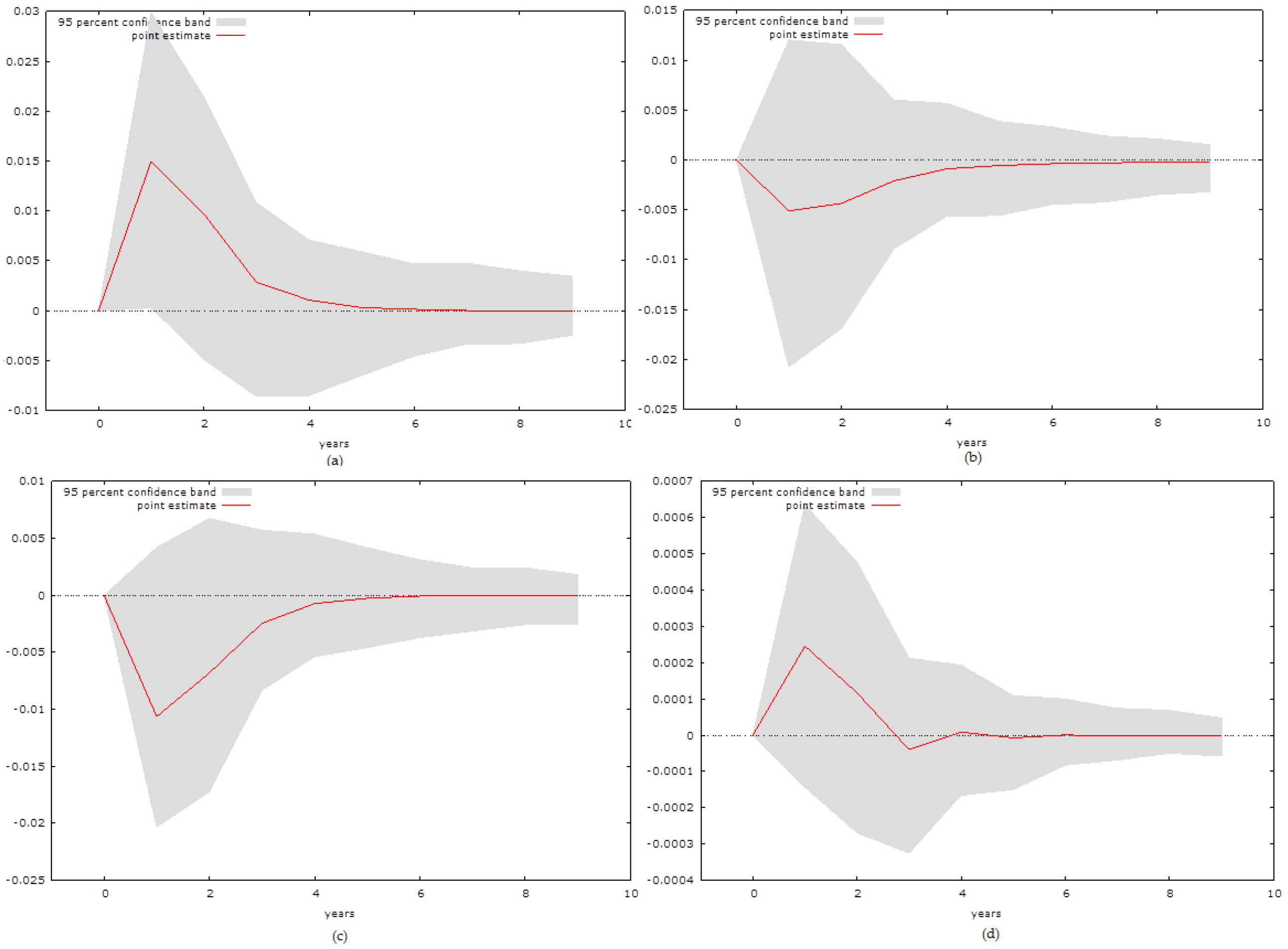 The possible empirical approaches are however limited. As the variables are not cointegrated, the approach developed by Peseran and Shin (1999 [27]) can be implemented only if the variables are stationary or stationary in their first difference. Therefore, it seems most logical to capture the relationship between the variables using a Vector Autoregressive (VAR) model approach. This paper analyses each country individually rather than using a panel setting. The key reason is that the small economies that are observed by the paper have highly specific properties that might be more difficult to observe in a panel setting. Thus, we focus on the two out of four possible equations that such an approach provides us with the following: