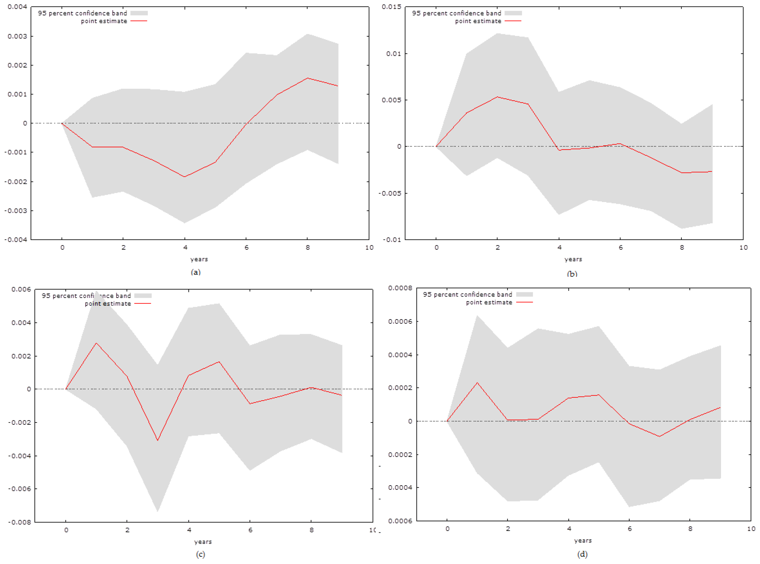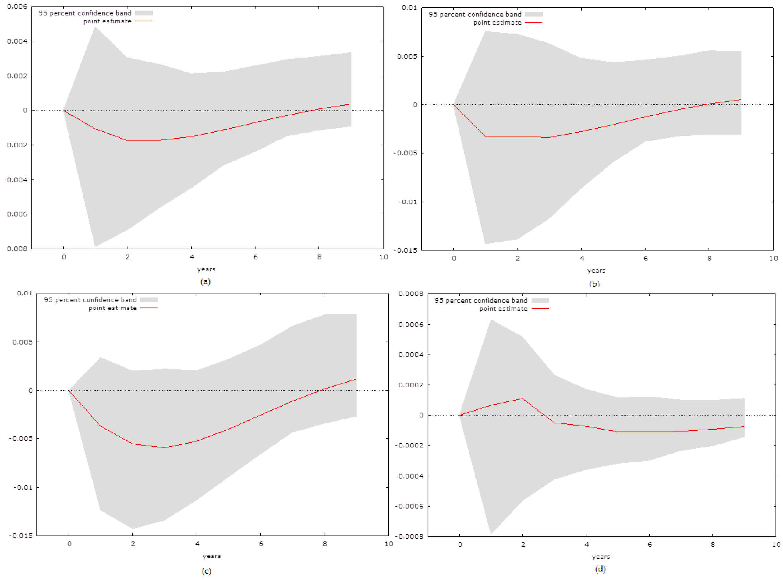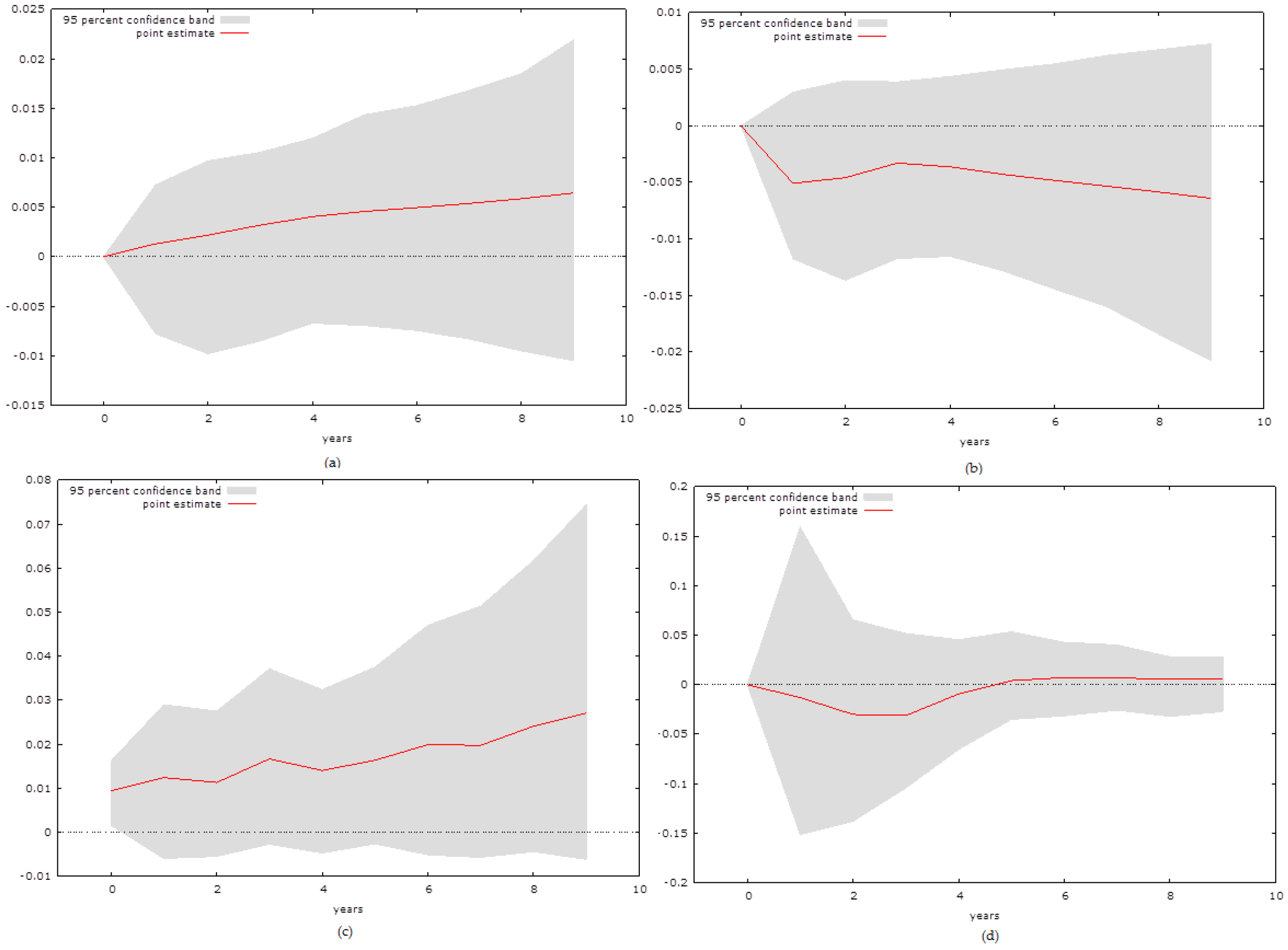 where the variables are abbreviated as specified in Table 1, α0 and β0 are the constants, α1..4 and β1..4 are the coefficients, εt,1,2 are the error terms in the maximum lag length n, determined based on the Akaike information criterion, in the time period t. The reason why we focus on these two specific equations is the research interest of this paper, which is determining the relationship between various forms of capital on economic growth, but we also include the question of whether natural capital has a significant effect on human capital. In order to examine the relationship we conduct Impulse Response Functions (IRF) that depend on the earlier work of Sims (1980 [28]).