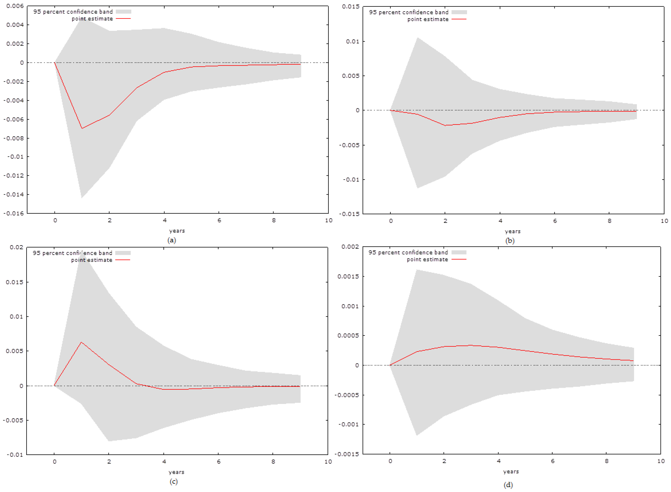 The diagnostic tests regarding the VAR models are presented in Table A2, where the results confirm that there is no presence of the ARCH effect and no serial correlation of the residuals in the relevant equations. We present the individual ARCH and autocorrelation results for the equations that are relevant rather than the average value of all of the equations, but there is no presence of autocorrelation or the ARCH effect in any of the observed models.