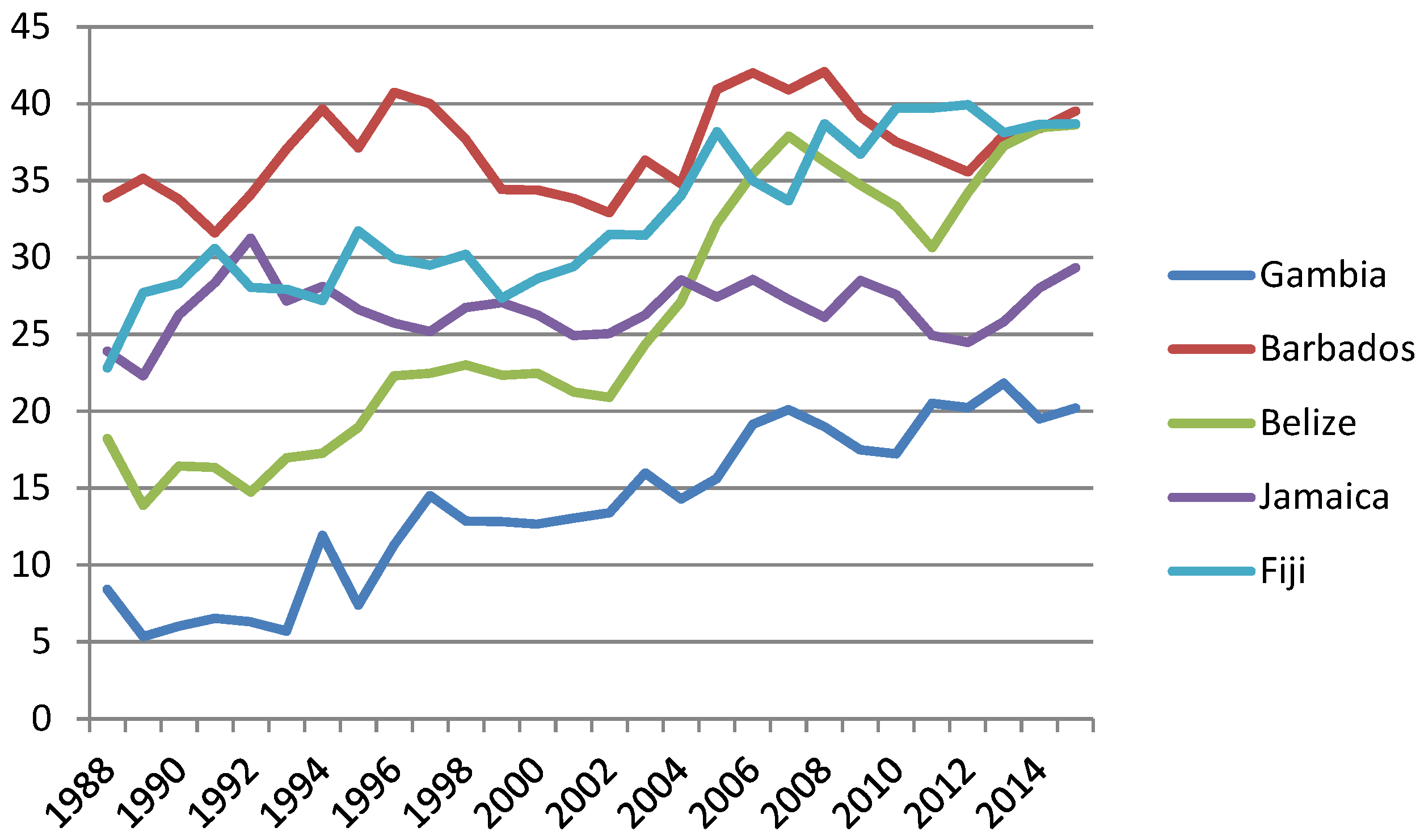 The Gambia is a country that has an increased reliance upon tourism, as it depends upon tourism for approximately 20% of its GDP [26]. In both sets of countries we have included countries that are neither completely dependent upon tourism, nor on natural resources, but a high portion of their respected economies still depend on this sector. This was done in order to observe whether there were any differences between the countries that were completely dependent upon a particular segment of their economy in comparison to those that were less dependent on either natural resources or tourism. In the case of the countries dependent upon tourism, the Gambia was that country as it is a relatively poor country with a low GDP per capita and it is highly reliant on foreign aid. The remaining economies are clearly highly dependent upon tourism as a source of revenue, which can clearly be seen from Figure B1, based on WTCT data [26].