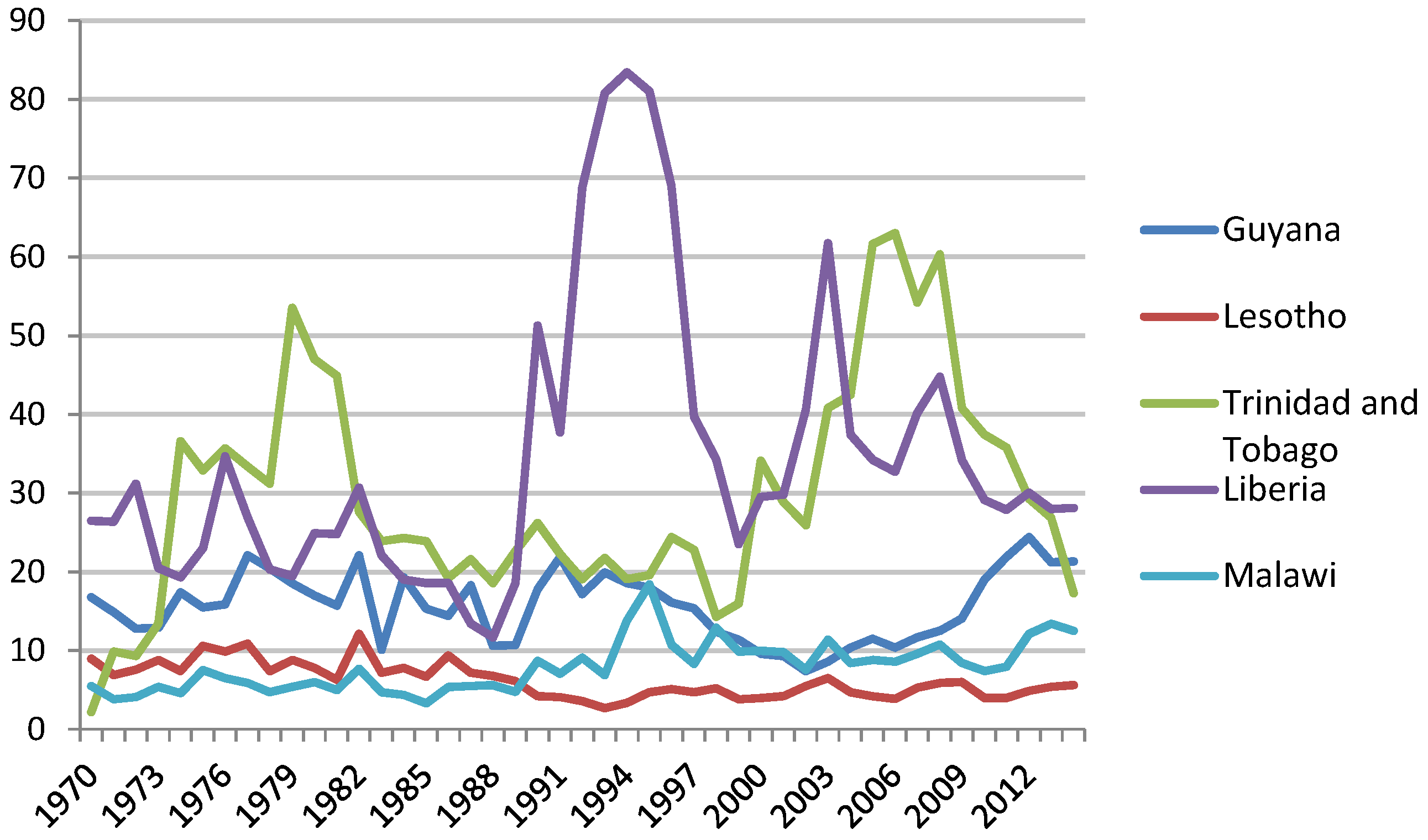 There is the evidence of an initial negative response for Liberia, though there seems to be evidence of a strong response that exists in Trinidad and Tobago and Lesotho. Unlike Lesotho and Trinidad and Tobago, Liberia is dependent on exports of goods such as iron ore, rubber, wood and cocoa beans [36], (Beevers, 2012 [37]). Based on this information, we conclude that Liberia’s exports are far more diversified than the exports of Trinidad and Tobago. It should be noted that most of the resources it exports are necessary for the functioning of modern industrial countries, unlike the products that Lesotho exports. It should also be noted that the prices of iron ore do not fluctuate negatively as the price of crude oil, as from 1986 to 2008 the price of iron ore has remained mostly stable with only two significant positive fluctuations in 2004 and 2008 [38]. As was previously emphasized, these economies do not have a strong position in determining the price and negotiating, which overall conforms to the conclusions of Braveboy-Wagner (2010 [39]).