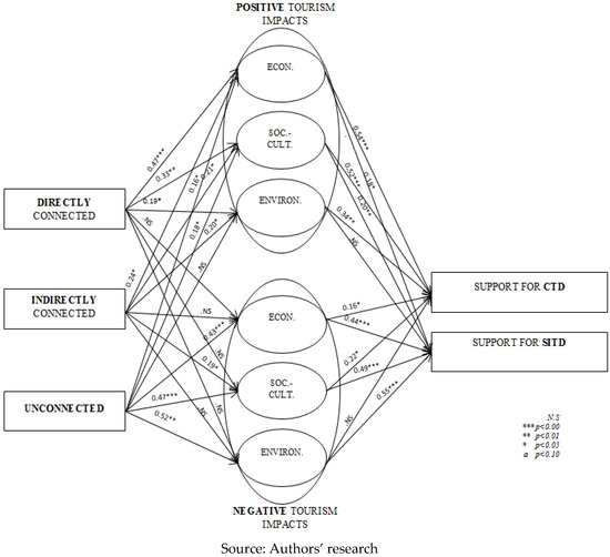 Table 3 displays standard error (SE) and the estimate divided by the standard error (Critical Ratio (CR) as well as supported and rejected hypotheses. Within the structural equation model, the estimates of the structural coefficient provide the basis for testing the proposed hypotheses. According to Table 3, all three hypotheses are confirmed in the estimated structural model, although some sub-hypotheses are rejected. Namely, residents who are directly connected to tourism industry perceive positive economic (γ = 0.47; t-value = 4.12), socio-cultural (γ = 0.33; t-value = 3.21) and environmental (γ = 0.19; t-value = 2.11) impacts of tourism. Residents who are directly connected to tourism industry do not perceive negative economic (γ = 0.06; t-value = 0.64), socio-cultural (γ = 0.07; t-value = 0.71) or environmental (γ = 0.03; t-value = 0.32) tourism impacts. Residents who perceive positive tourism impacts support CTD: those who perceive positive economic impacts support CTD (γ = 0.54; t-value = 5.37) more than SITD (γ = 0.22; t-value = 2.36); residents who perceive positive socio-cultural impacts also support more CTD (γ = 0.52; t-value = 5.28) than SITD (γ = 0.20; t-value = 2.13); and those who perceive positive environmental tourism impacts support more CTD (γ = 0.34; t-value = 3.40) than SITD (γ = 0.03; t-value = 0.38). This means that hypothesis one is supported.