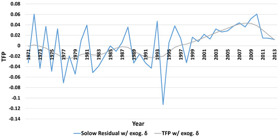 Once the LHS terms of Equation (A5) are known, implicit rate of return on capital can be computed. Roe et al. (2014) observe that we require no knowledge of the fixed factor other than its shadow or rental value used in the calculation of or utilize the value reported in the Global Trade Analysis Project (GTAP) data set. Therefore, the Solow’s residual for the sector employing the fixed factor H with technology is