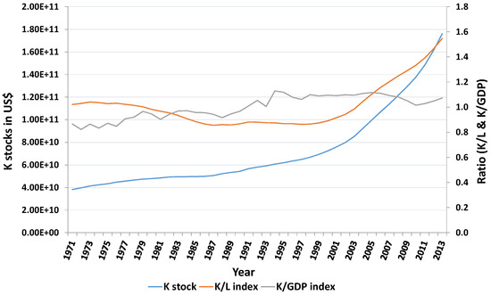 A close inspection of the data shows that this happened in the year 1972 when labor force grew by about 124% from the year 19707. Overall, we find capital deepening in industry during the period 1971–2013 to be declining at 6.8%. Service sector overall witnessed a rise in capital deepening of approximately 2% per annum over the same period (1971–2013). However, when separated into two time periods, capital deepening before 1991 is declining and increasing from 1992 to 2013. The number of people employed by the service sector rose steadily while capital stocks rose faster, at a rate almost equal to the rate in the industry sector.