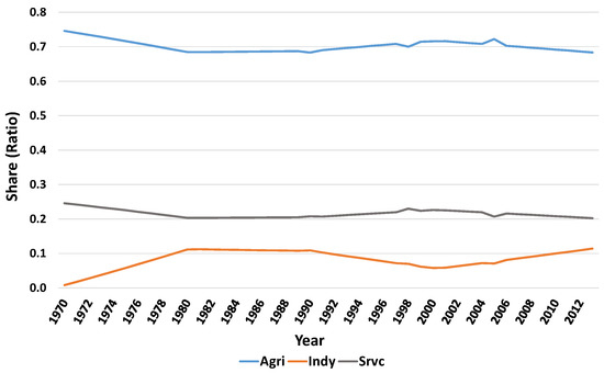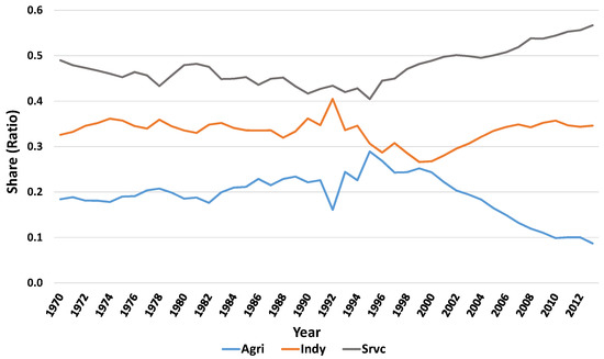 Next, we address whether the features of growth of the aggregate economy emanated from all sectors of the economy or they are specific to a particular sector. We disaggregate the data and analyze each sector’s contribution to GDP as well as the contribution to employment. Figure 3 shows the trend of GDP share by each sector for the period 1970–2013. Note that the typical structural transformation experienced by developing countries is observed only after 1995. Since 1995, agriculture’s of GDP shrunk, while the shares of other sectors are on the rise. Before 1995, however, little trend is observed in sector GDP shares.