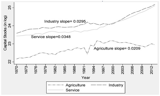 Overall, growth rates in the labor force have not been so different between agriculture and service sectors (2.5% compared to 2.2%) while labor growth rate in the industry sector has been high at around 11% per annum. This increase in labor observed in the industry sector could possibly be arising from the increased production in the mining industry and the opening of new industries processing food items (Ndulo and Mudenda 2010; Carmody 2009). Industry and service sectoral capital stocks have been growing almost at the same rate of about 4%.