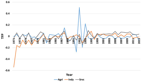 Table 6 shows results from the sectoral growth accounting. For each sector, we show the contribution of capital, labor, and TFP to the growth of the sector. For agriculture, we include the contribution of land. We divide time into three periods: (i) the pre-reform period of 1971–1991; (ii) the post-reform period from 1992 to 2013; and (iii) the overall (1970–2013). We do this so as to observe differences in the sectoral TFPs between the two periods. The first column in each period reports the point contribution to a sector’s growth and the second column reports the share of the factor’s contribution to the sector growth.