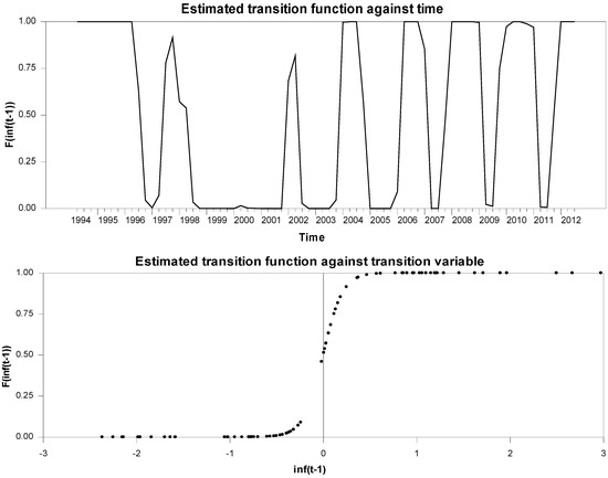 As can readily be seen from Table 4, the null hypothesis of linearity is rejected for lagged inflation only. This finding implies that inflation behavior exhibits a switching regime governed by the level of inflation realized in the previous period. The used transition variable is past inflation suggesting that the relationship between inflation rate and the output gap depends upon the inflation trend (low or high inflation level).