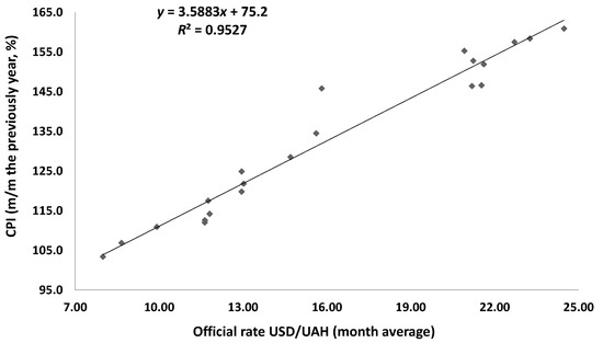The results of our calculations shown in Figure 2 and Figure 3, indicate that the official hryvnia exchange rate and inflation (Consumer Price Index-CPI) are tightly linked in Ukraine. Moreover, today, after the transition to the regime of “dirty” (administratively regulated) floating (since February 2014), the mentioned link, taken with the two-months lag with regard to price reactions to the changes in exchange rates, became almost functional (95, 3% of the inflation volatility is caused by devaluation of the hryvnia exchange rate against the US dollar).