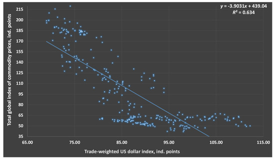 Relationship between overall index of world trade and trade-weighted US dollar index in 1992–2015 years. Note: Calculated according to IMFCCMS and FRED data (All Commodity Price Index: Quandl, https://www.quandl.com/data/ODA/PALLFNF_INDEX-All-Commodity-Price-Index; Federal Reserve Bank of St. Louis, https://research.stlouisfed.org/fred2/series/TWEXMMTH#).