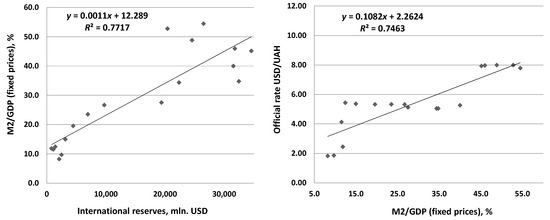 A substantial increase in export earnings in Ukraine from November 2001 to June 2008, which was the result of the US dollar devaluation and price rise in world commodity markets, as well as the significant inflow of foreign capital, gave rise to the need for the NBU interventions to prevent significant revaluation of hryvnia. These interventions had adverse monetary effects-buying flows of export currency earnings, as well as incoming flows of currency, which came in through the financial account channel (direct, portfolio and other investments in Ukraine), the National Bank was gradually increasing its international reserves. However, with the growth of reserves, the monetization of the Ukrainian economy was also growing rapidly (monetary aggregate M2 to GDP), the level of which caused considerable devaluation pressure on hryvnia. The hryvnia devaluation with a slight time lag became another trigger unwinding the inflationary spiral in the dependence on Ukraine’s imports. Further evidence of our judgments is presented in Figure 6.
