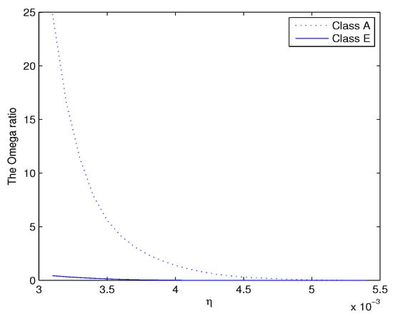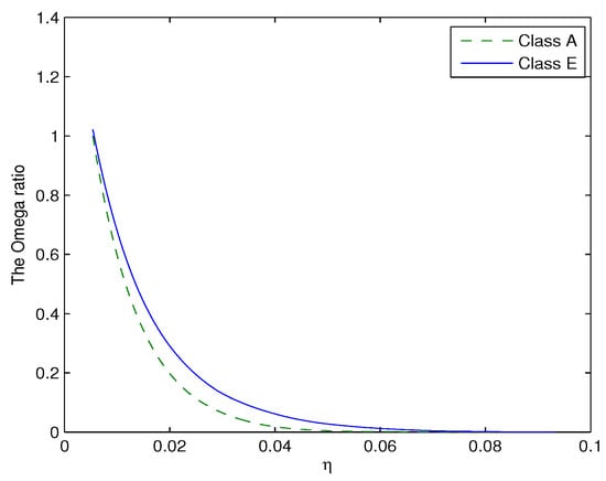 Continuing with our analysis in the rental yield, we find that when , is smaller than , while when , is larger. Thus, there is no OD relationship between A and E. To illustrate our results empirically, we set . The related results are exhibited in Figure 2. From this figure, it is clear that the Omega ratio of Class E is larger than that of Class A. For the Omega ratio dominance, different from the analysis for the rent yields, there is no dominance relationship between A and E in terms of the price yield by using the Omega ratio, and thus, we conclude that there is no FSD relationship between A and E in terms of the price yield.