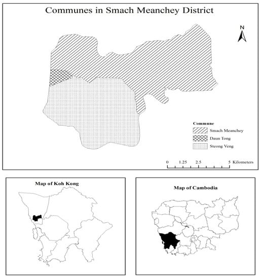 According to the national census in 2008, Koh Kong is divided into eight districts with 33 communes. This study was conducted in the Smach Meanchey district, where the provincial town of Koh Kong is located, which later was changed to Khemarak Phoumin district. It is comprised of three communes: Smach Meanchey, Daun Tong, and Steong Veng. The population of Smach Meanchey was about 29,329 which was 21% of the total population in Koh Kong, according to national census in 2008. Base on the national census (1998) conducted by the National Institute of Statistics (NIS), an urban area refers to any district in which a provincial town is located. With a clarification of the term “urban” due to population growth, the new definition of “urban” was adopted in 2004 and was used in the national census in 2008 based on three categories: population density exceeding 200 per Km2, percentage of males employed in the agricultural sector lower than 50%, and the total population of a commune exceeding 2000 ().