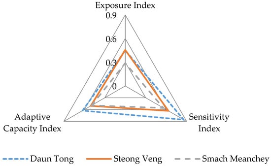 Figure 3 indicates the vulnerability triangle of the three communes. While the exposure rate was similar between Daun Tong and Steong Veng communes, in terms of adaptive capacity and sensitivity, Daun Tong held a relatively higher degree.