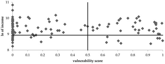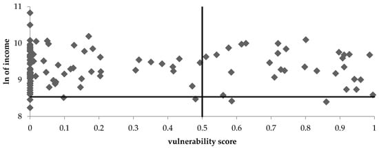 Figure 4 and Figure 5 identify the clusters of vulnerability and household income in the natural logarithmic form. The first one indicates the use of the national poverty line; the second applies the international poverty threshold. The area below the horizontal line is considered to be poor, while the area above is viewed as non-poor. On the other hand, the area on the left-hand side of the vertical line with vulnerability ≤ 0.5 is not considered to be vulnerable, while the right-hand side area represents the vulnerable households.
