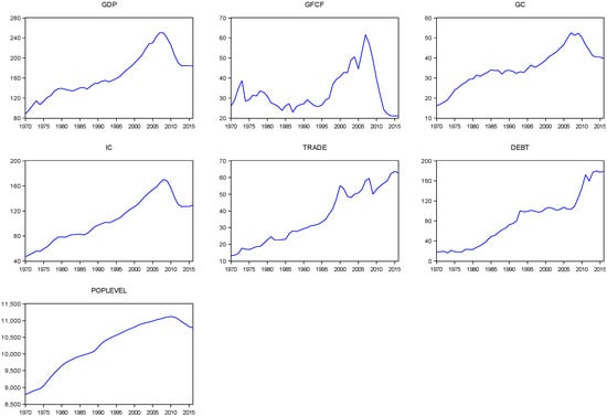 Moreover, Figure 1 and Figure 2 present the movement of debt and other determinants of the Greek economy over the period 1970–2016. Over the period 1995–2008, GDP has significantly increased, but after 2009 it rapidly decreased. The Greek economy has remained in recession during the period 2009–2016 and the recovery in 2014 was limited and soon fizzled out. With few exceptions for some years, investment, private and government consumption, trade openness and population have followed a similar course for the period 1970–2016. On the other hand debt-to-GDP has significantly increased over the period 1995–2008, but it rapidly increased during the period 2009–2016. Therefore, the graphs show that the economic crisis has a significant negative effect on economic growth as having been mentioned by the studies of () and ().