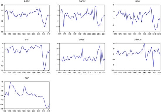 Growth rates of the variables. (Source: The data selected from AMECO database for the time period 1970–2016. D indicates that the variables are expressed in growth rates. GDP is the real GDP, GFCF is the gross fixed capital formation, GC is the final consumption expenditure of general government, IC is the private final consumption expenditure, debt is the debt-to-GDP ratio, trade is the trade openness-to-GDP ratio and pop is the population number in persons. All data are obtained from Authors’ calculations.).
