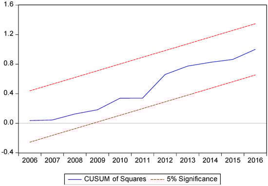 In order to ensure the robustness of the ARDL model, it could be useful to evaluate the stability of the estimated parameters. To test the null hypothesis of model stability, we apply the cumulative sum of recursive residuals (CUSUM) and the CUSUM of square (CUSUMSQ) tests (). CUSUM statistics and bands represent the bounds of the critical region for the test at the 5% significance level. The test finds parameter instability if the cumulative sum goes outside the area between the two critical lines. Figure 3 and Figure 4 plot the results for CUSUM and CUSUMSQ tests. The results show that the plot of the CUSUM and CUSUMSQ statistic stays within the critical bounds of the 5% confidence interval, implying not rejection of the null hypothesis of stability. Therefore, that indicates the absence of any instability of the regression coefficients.