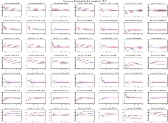 Impulse Response Function (IRF). (Note: D indicates that the variables are expressed in first difference. GDP is the real GDP, GFCF is the gross fixed capital formation, GC is the final consumption expenditure of general government, IC is the private final consumption expenditure, trade is the trade openness-to-GDP ratio, debt is the debt-to-GDP ratio and POP is the population number in persons. The data selected from AMECO database for the time period 1970–2016.).