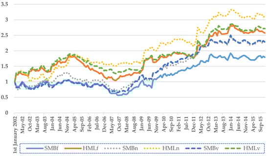 Cumulative value of the size and value factors using three different methodologies. Source: Author’s own plotting. The sample period is 2002:01–2015:12. Source: the official website of the Pakistan stock exchange (https://www.psx.com.pk/) and the official website of the State Bank of Pakistan (http://sbp.org.pk/).