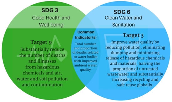 | 6.3 By 2030, improve water quality by reducing pollution, eliminating dumping and minimizing release of hazardous chemicals and materials, halving the proportion of untreated wastewater and substantially increasing recycling and safe reuse globally | 3.3 By 2030, end the epidemics of AIDS, tuberculosis, malaria and neglected tropical diseases and combat hepatitis, water-borne diseases and other communicable diseases |