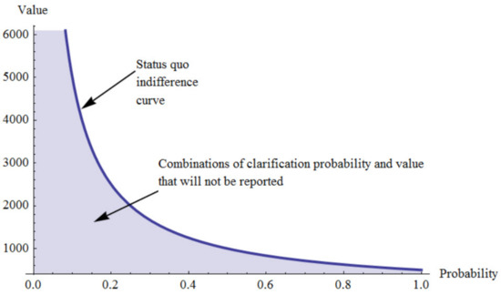 If the victim has insurance against theft, the indifference curve—with the assumptions that we have made—will be independent of the subjective clarification probability. Figure 3 shows the indifference curve in the -plane. Only combinations of V (value) and t (time) which are above this line will be reported.