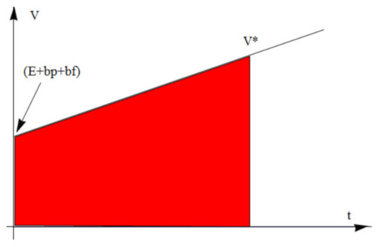 The indifference curve in the case where the victim holds an insurance and the return value in case of clarification equals zero. Only the combination of V and t which is located above the line will be reported. The shaded area represents the combinations that will not be reported.