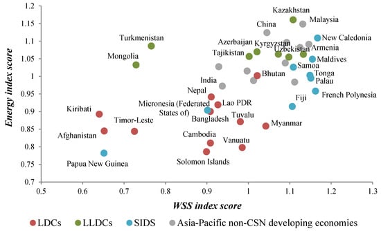 Index scores in the energy and WSS sectors in Asia and the Pacific. Source: Authors’ calculation. See Appendix B for details. Notes: Appendix A provides a complete list of countries and country groupings. “Asia-Pacific non-CSN developing economies” refers to the thirteen other Asian developing countries. The figures are based on data from 2015 for the WSS sector and 2012 for the energy sector. The energy index score is calculated, for each country, as the simple average of standardized values of the two energy infrastructure indicators. The WSS index score is the simple average of standardized values of the four WSS infrastructure indicators. Each standardized value is computed to have a mean of 1 and a standard deviation of 0.15 so that the units of these values are consistent. LDCs—least developed countries; LLDCs—landlocked developing countries; SIDS—small island developing States; WSS—water supply and sanitation.