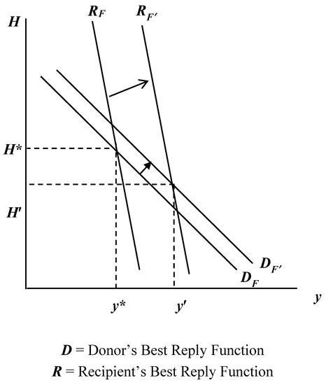 Throughout this section, we retain the leader-follower structure consistent with an altruistic donor that makes its aid policy contingent upon the recipient’s income. Consequently, the donor takes y as given and maximizes (12) with respect to aid, H, yielding the following best reply function: