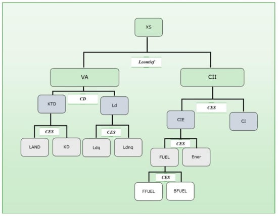 The CGE component of our model (hereafter referred to as the CGE module) is based on the EXTER model of Decaluwé et al. (2001), with significant further developments, which we describe herein. The production structure is substantially modified6. We adopted a multilayered production structure as illustrated in Figure 1.