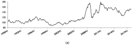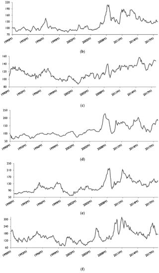 As shown, the food price index was characterized by an important increasing trend, particularly starting from 2007. The price index increased by about 45% from 113% in 2007M01 to reach 164% in 2008M08, which coincides in time with the world food crisis. There was another rise in the price index in 2010–2011 (more than 180% in December 2010). Regarding the evolution of the various food commodities, it is useful to note that all price indices have also increased, especially during the food crisis episode. The highest increase is observed for the sugar price index and the dairy price index, which reached 319% in December 2010 and 228% in November 2007, respectively. While the meat price index exhibited an increasing trend between 2003 and 2017, it did not exceed 160%. Overall, a rise of the global and sub-indices has been observed over the full period. With reference to the oil price, the same figure shows that until 2003, the Brent and WTI prices remained stable with a slight fall in 1998. However, prices jumped considerably starting from 2003 and settled at a historical record high above $140. In real terms, prices reached $150 per barrel for the Brent crude oil and $149 per barrel for the WTI crude oil in June 2008. The second rise of oil prices occurred in 2011, when they rebounded above $120 per barrel (April 2011). It is useful to mention that the rise of food prices and oil prices occurred in almost the same period. The fall of oil prices after 2008 has been weakly associated with a decrease of almost all food price indices, which gives a preliminary intuition of the presence of asymmetry in the relationship between them.