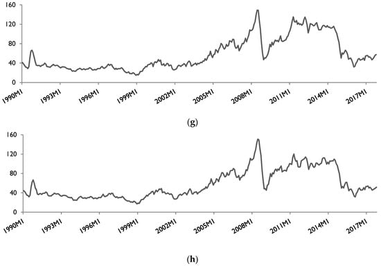 Plots of variables. (a) Food price index; (b) cereals price index; (c) meat price index; (d) dairy price index; (e) vegetable oils price index; (f) sugar price index; (g) Brent crude oil price (US$ per barrel); (h) West Texas Intermediate (WTI) crude oil price (US$ per barrel).
