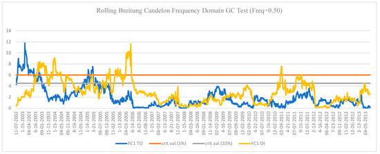 Figure 2 and Figure 3 present the rolling frequency domain causality from PCR volume and open interest to market return. Notably, short term causalities were estimated at frequency of 2.5 corresponding to 2–3 days, as presented in Figure 3, and long-term causality at frequency of 0.50 corresponding to 12–13 days is estimated, aas presented in Figure 2.