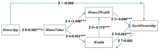 StockOwnership is a dummy variable. We transferred it into the predicted probability of a household participating in stock market before SEM estimation by applying the logistic regression method using control variables. When the stock investment was measured with stock ownership (StockOwnership), Figure 3 indicates all but two paths are significant. The path of the direct effect of house appreciation on stock ownership (β1) and the path representing the effects of stock ownership on wealth (β7) are statistically insignificant.