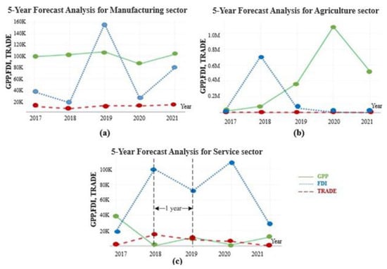 - For five-year forecast (2017–2021), the FDI and TRADE appeared to be the important contributions towards the SEZ. However, GPP and FDI displayed sharp fluctuations, and TRADE behaved constantly. Therefore, the government should encourage their competitiveness and maintain continuity of foreign investment and trade policies.