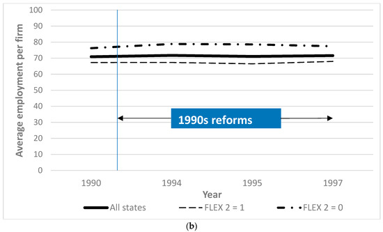 Figure 1b illustrates that on average, formal firms in states with less flexible labour markets (the definition of which is discussed further in Section 3.3) tend to be a little larger than their counterparts in states with more flexible labour markets, but there is no visible increasing or decreasing trend in these averages over the 1990–1997 period. In this paper, I explore whether the policy changes initiated in the 1990s had differing, and potentially mutually negating, formal firm employment effects, which could in theory be masked by the stable average employment estimates that are visible in Figure 1b.