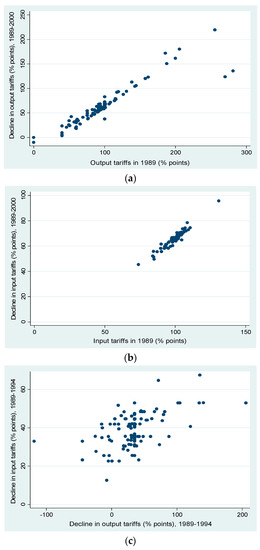 As discussed in Section 2.2, final goods tariffs declined precipitously in 1992, which was the first year of reform implementation following the balance-of-payments crisis of 1990–1991. Input tariffs also fell and converged in the post-1991 period and display less variance relative to final goods tariffs. The scatterplots in Figure 2a,b capture tariff levels in 1989 and the declines that occurred in the 1989–2000 period for output and input tariffs, illustrating how the highest pre-reform tariff rates were subjected to the largest cuts3. Figure 2c plots pairwise declines in final goods tariffs and input tariffs over the 1989–1994 period. The resulting scatterplot suggests that while there may be a positive association between the shifts in tariff rates4, it is not sufficiently strong for multicollinearity to pose major concerns.