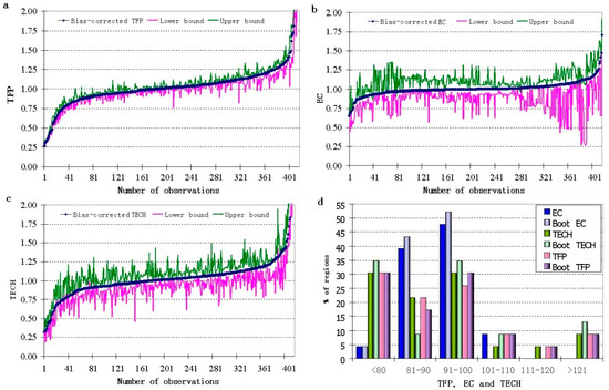 Figure 1a–c present graphical representation of bootstrapped TFP and its components for all regions over the study period. We observe that the confidence interval is highest for EC compared to TFP and TECH. Frequency distribution of original and bootstrap TFP, EC, and TECH for the regions is presented in Figure 1d. Comparing the bootstrap to the original estimates, it can be concluded that the bootstrap technique helps in reducing ambiguity of the result.
