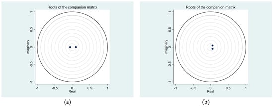 Stability of the VAR models: (a) logfdit and logintatt; (b) logfdit and logintall.