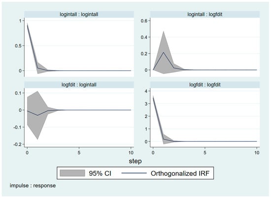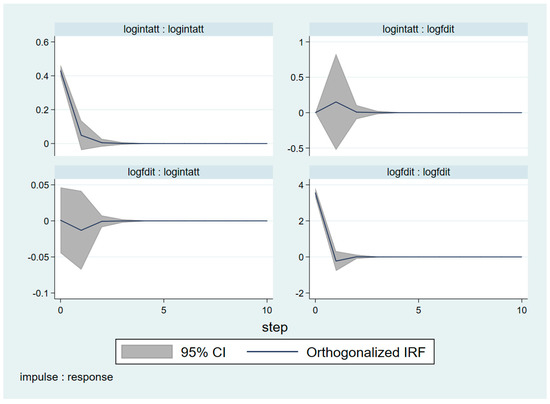 The variance decomposition of the first pair of variables, logfdit and logintatt, and the second pair of variables, logfdit and logintall, is shown in Appendix A (Table A3). The analysis was conducted for the prognostic period of the next 10 years. The variance decomposition shows the relative share of individual variables in the explanation of the variance of the second variable in the following periods. All the variables almost fully explain their prognostic errors as far as the prognostic period is concerned. Following Abrigo and Love (2015) the IRF confidence intervals are computed using 200 Monte Carlo simulations based on the estimated model.
