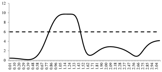 The frequency domain causality test results for the null hypothesis that economic growth does not Granger-cause trade openness are presented in Figure 2. The results in Figure 2 suggest that economic growth is found to Granger-cause trade openness in the frequency range of [0.48, 0.83], which corresponds to 7.5 and 13 years. Please note that we also estimated the model for the 1974–2014 period with the FDI variable included in the control variables set. We found that the Granger-causality results from a model which includes FDI do not differ significantly from a model which does not include the FDI variable.