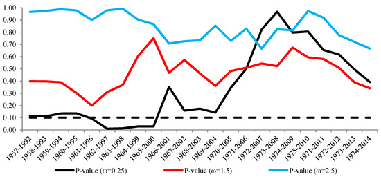 It should be noted that we employed time-varying Granger-Candelon-Breitung-causality test for several frequency points (such as ω = 0.25, 0.5, 1.0, 1.5, 2.0, and 2.5 and it represents t = 25.1, 12.5, 6.2, 4.1, 3.14, and 2.5 years, respectively) and we found similar results for different frequency points. Therefore, we present the test results only for three frequency points; the results for other frequencies are available upon request. In Figure 3, we present the probabilities for the null hypothesis of trade openness is not Granger cause of GDP. The results in the Figure 3 indicate that the null hypothesis of “trade openness does not Granger-cause economic growth” can be rejected only at a low frequency (ω = 0.25 and t = 25.1 year) and at specific time periods. These findings suggest that trade openness Grange-cause real GDP growth for the periods of 1961–2000 in Turkey and that this can be evaluated as rather long-run Granger-causal relationship. Note that we cannot reject the null hypothesis at higher frequencies. Hence, these results indicate the lack of a Granger-causal link running from trade openness to real economic growth in the short-run.