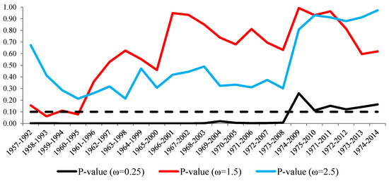 Time-varying Granger-Breitung-Candelon Causality test results running from trade openness to real GDP growth with a rolling-window of 35 years. The vertical axis shows the p-values. The p-value is the estimated probability to reject the null hypothesis of no Granger-causality. Dashed line indicates 10% statistical significance level. Lag lengths in the model specification are determined as 7. The VAR model is estimated with p + 1 lags.