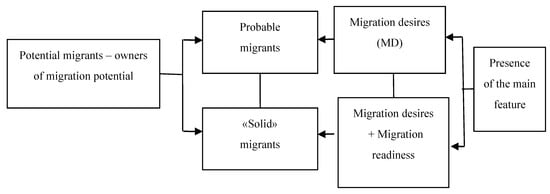 It is well known that the migration behavior of a person (migration or rejection) to a considerable extent depends on their migration attitude. Migration attitude is the psychological regulator of human behavior, disposition to migration, and change of lifestyle. It can be defined as inclination (or absence of it) of a person towards migration activity in a certain situation or under relevant conditions. The share of the population with a positive migration attitude—migration desires but without making a final decision about migration—amounts to the possible migration potential of a territory. “Solid” migrants are the core of migration potential—these are persons with the formed migration readiness. In our opinion, such a type of migrants is characterized by the following key aspects: psychological readiness to leave a certain settlement, to relocate; a decision on migration; and certain actions related to implementation of this decision. While studying the migration capacity of certain territory, it is important to take into account the share of both “solid” and possible migrants. A schematic model of migration potential analysis is suggested in Figure 1.