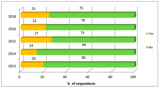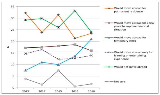 Answers to the question “Are you planning to be employed abroad in the nearest 5 years?”, in % of the respondents who answered this question (according to the results of 2013–2016, 2018 panel survey). Source: own data.