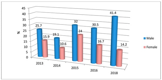Males have always been more active in migration processes than females, not only in Ukraine but in the majority of countries globally. Therefore, the prevalence of males among the unemployed ready to be employed abroad in the near term is not unexpected (Figure 3). However, it is worth mentioning an important observation: the considerable growth of this share in 2015 against a background of general growth of the number of “solid” labor migrants and the fact that it remained almost at the same level in 2016 with a certain reduction of such a type of migrants. In 2018, the share of respondents planning to work abroad grew among males by 10 percentage points in comparison with 2016.